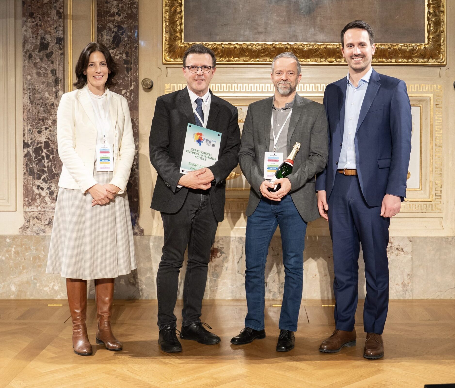 Überreicht wurde die Urkunde von Bildungsminister Christoph Wiederkehr MA, Mag. Nina Brenner  (Referatsleiterin der Abteilung für kaufmännische Schulen im Bildungsministerium) an Dir. Johann Rabl und den EESI-Verantwortlichen der JO.HAK Prof. Michael Spannberger.